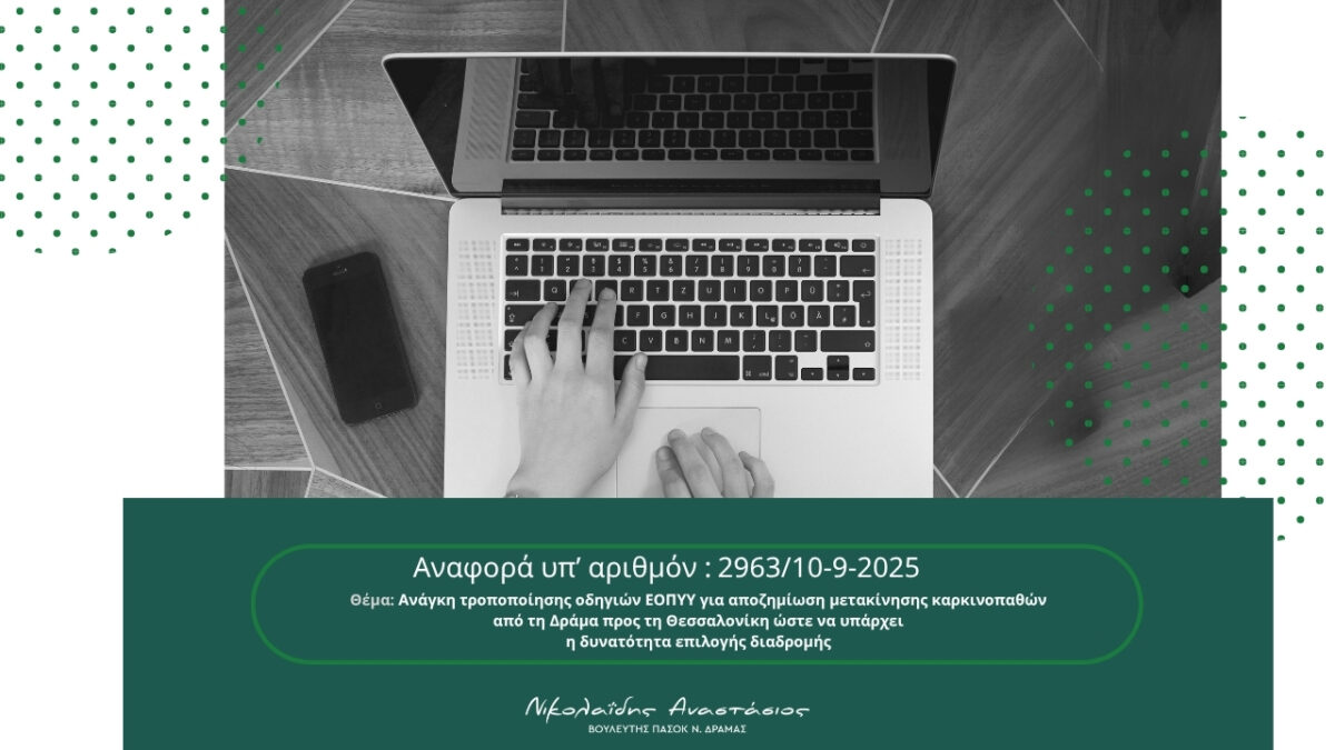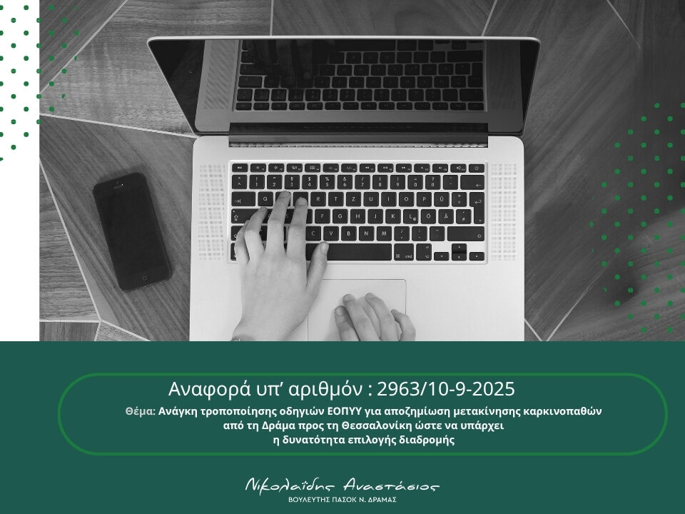 21 October 2025 21 October 2025Αναφορά προς το Υπουργείο Υγείας για την ανάγκη τροποποίησης οδηγιών ΕΟΠΥΥ για αποζημίωση μετακίνησης καρκινοπαθών από τη Δράμα προς τη Θεσσαλονίκη ώστε να υπάρχει η δυνατότητα επιλογής διαδρομής {21.10.2025}Η κατατεθείσα αναφορά προς το Υπουργείο Υγείας: Η απάντηση του Υπουργείου Υγείας: