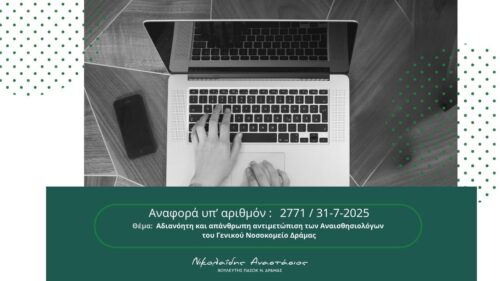 Αναφορά προς το Υπουργείο Υγείας για αδιανόητη και απάνθρωπη αντιμετώπιση των Αναισθησιολόγων του Γενικού Νοσοκομείο Δράμας {25.09.2025} Διάβασε περισσότερα »